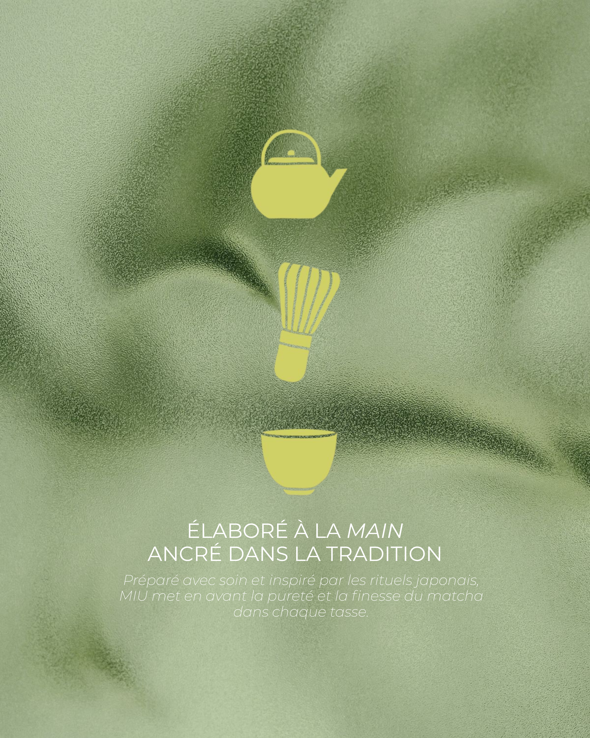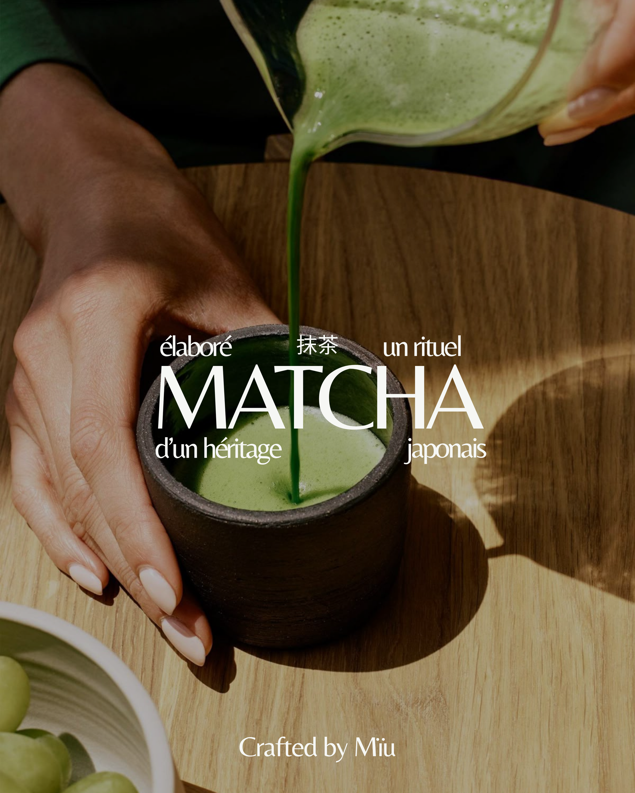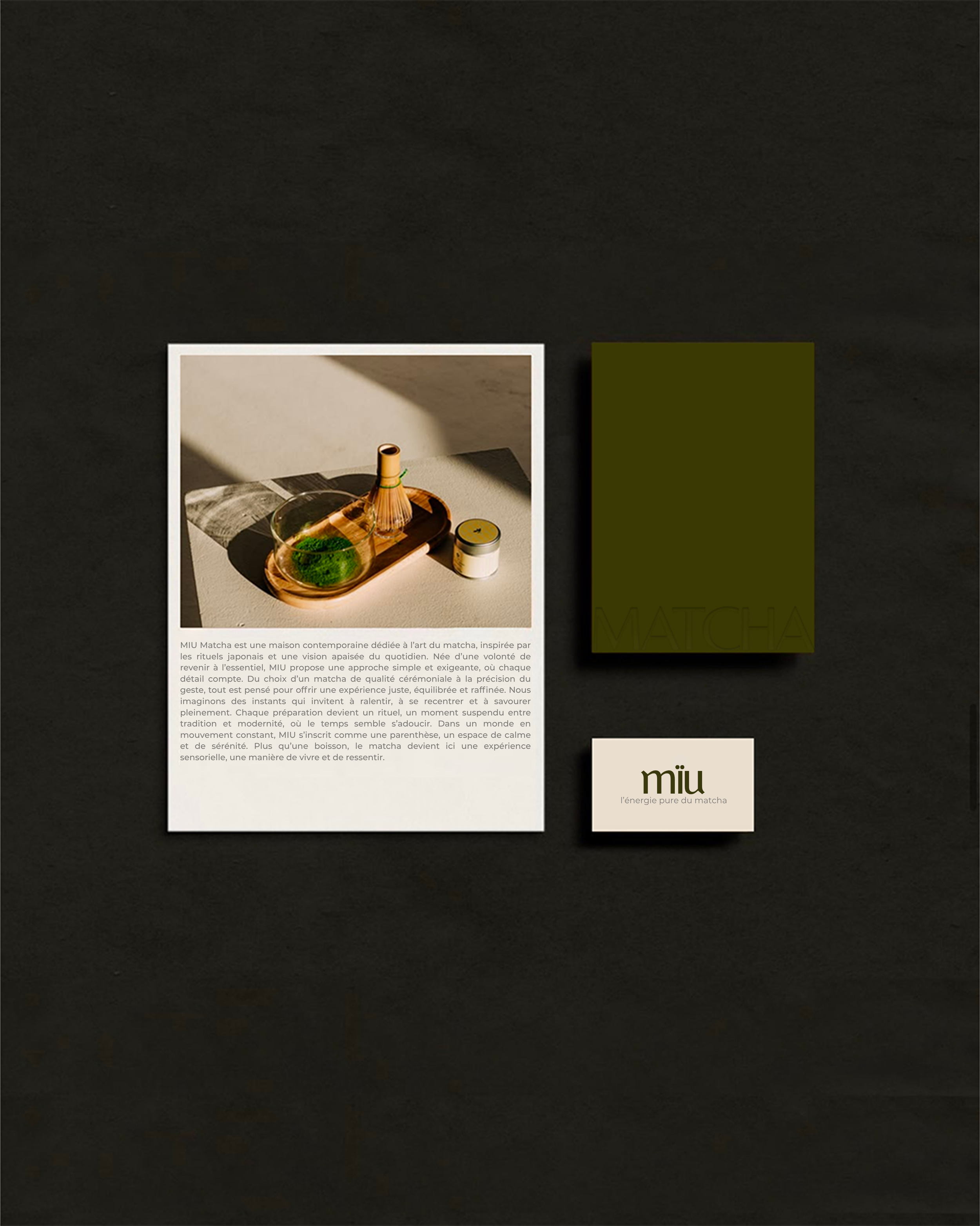 J’ai accompagné Miu Matcha dans la création de son identité visuelle, en développant une direction artistique alignée avec ses valeurs : authenticité, calme et exigence. Chaque élément a été conçu pour instaurer une atmosphère harmonieuse, où le minimalisme dialogue avec la richesse des sens.