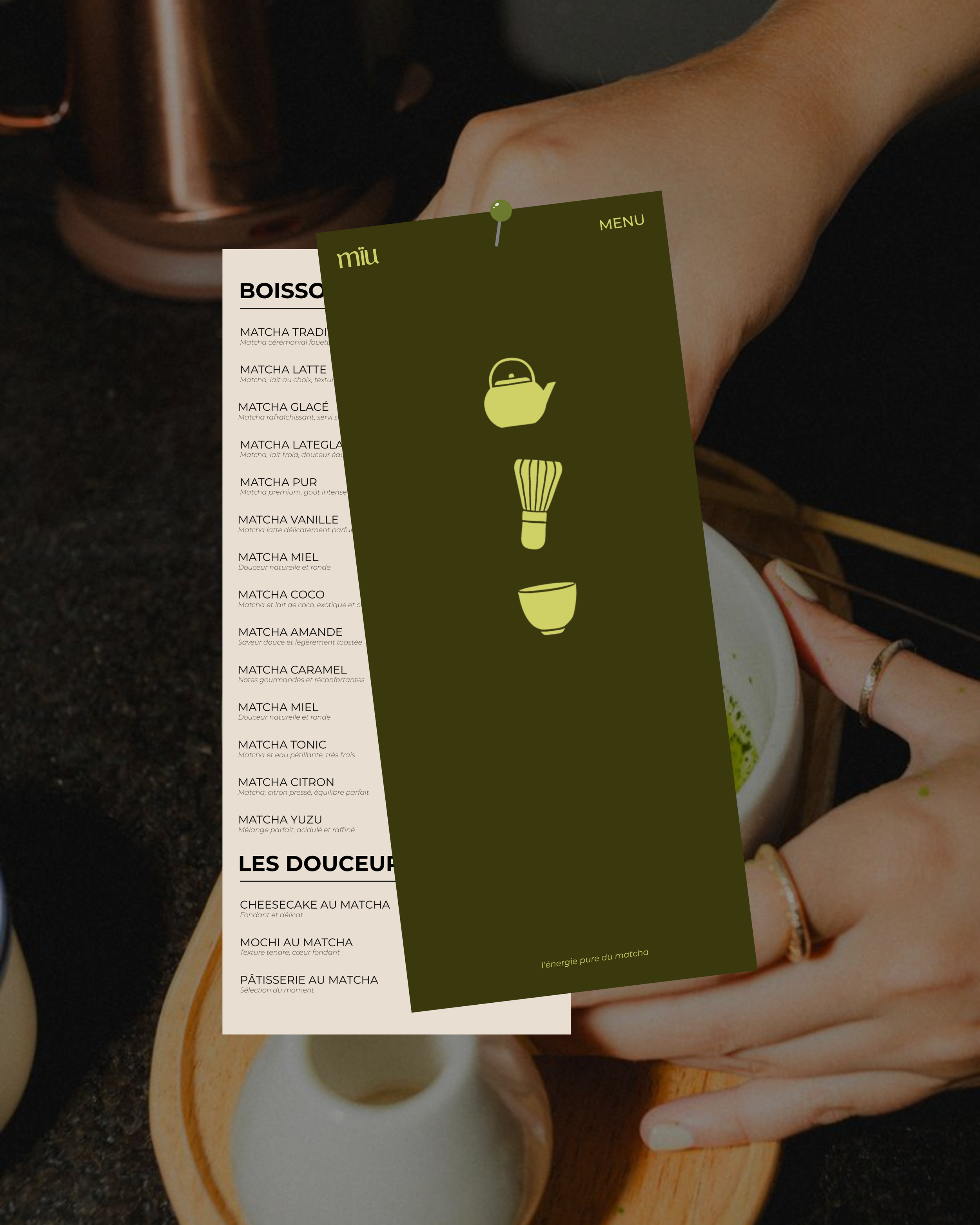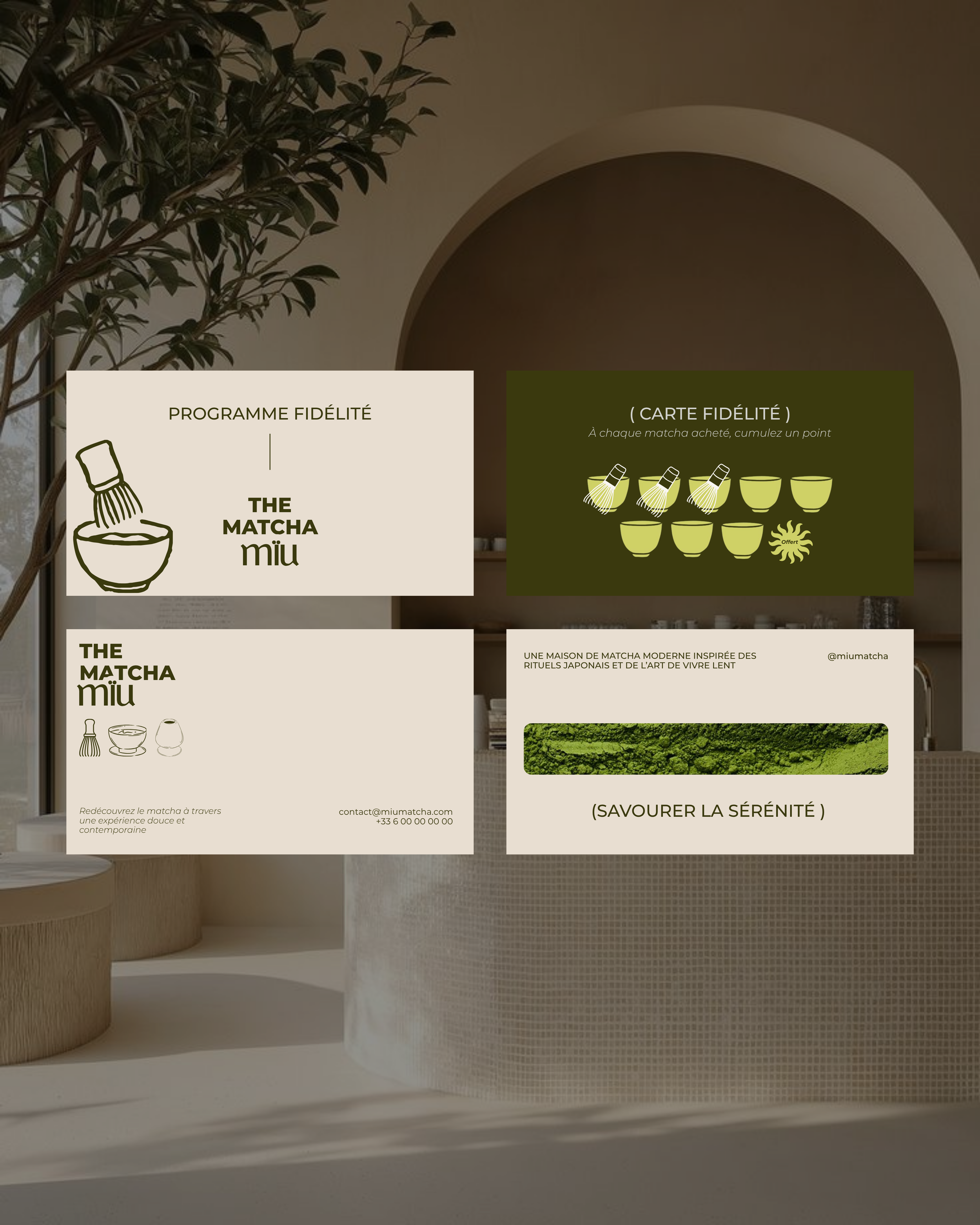 Pensé pour une clientèle en quête de bien-être et de qualité, Miu Matcha propose une vision contemporaine du rituel du thé. Les espaces et les supports visuels s’inscrivent dans une cohérence globale, mêlant matières organiques, nuances subtiles et lumière maîtrisée, pour offrir une expérience à la fois douce, immersive et mémorable.